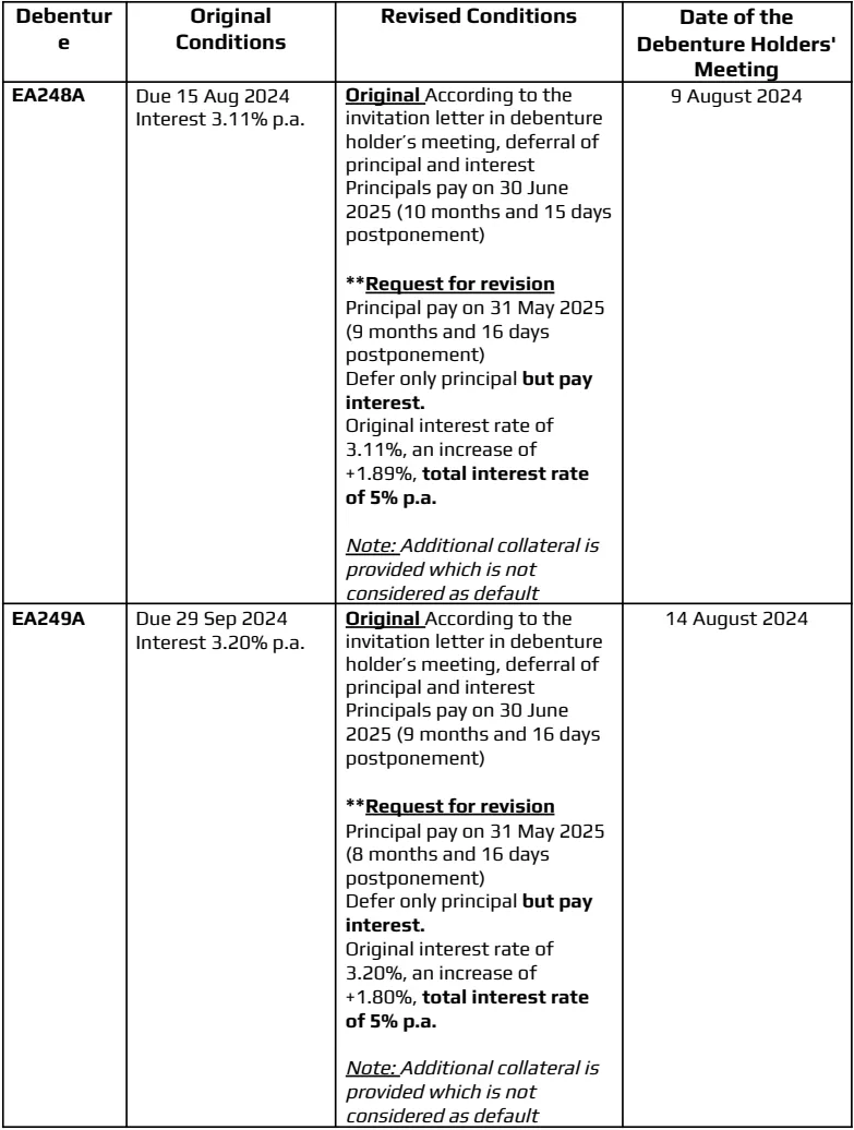 Regarding the two series of debentures, consisting of EA248A worth 1,500 million baht due on August 15, 2024, and EA249A worth 4,000 million baht due on September 29, 2024, the company will proceed to request a postponement of the redemption dates. It will also increase the interest rate to 5% per annum for both series and provide additional collateral without being considered a default event. The company confirms it will pay the due interest, only requesting a postponement of the principal repayment.