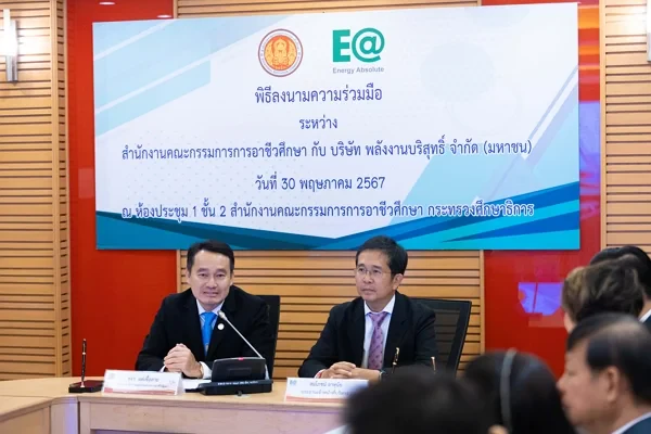 นายสมโภชน์ อาหุนัย ประธานเจ้าหน้าที่บริหาร บริษัท พลังงานบริสุทธิ์ จำกัด (มหาชน) หรือ EA ร่วมกับ นายสง่า แต่เชื้อสาย ผู้ช่วยเลขาธิการคณะกรรมการการอาชีวศึกษา ผู้แทน นายยศพล เวณุโกเศศ เลขาธิการคณะกรรมการการอาชีวศึกษา ลงนามความร่วมมือ ขับเคลื่อนการผลิตและพัฒนากำลังคนอาชีวศึกษา เพิ่มทักษะด้านแบตเตอรี่และยานยนต์ไฟฟ้าขั้นสูง หนุนการเรียนรู้แบบทวิภาคี ส่งเสริมความสามารถผู้เรียนอาชีวศึกษาในทุกมิติ โดยมีนายจำรัส สว่างสมุทร ผู้ช่วยประธานเจ้าหน้าที่บริหาร บริษัท พลังงานบริสุทธิ์ จำกัด (มหาชน) พร้อมด้วยผู้บริหารสถานศึกษาร่วมพิธี ณ ห้องประชุม 1 สำนักงานคณะกรรมการการอาชีวศึกษา
