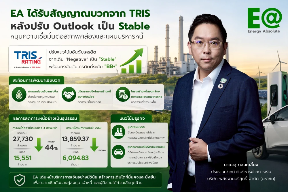 EA ได้รับสัญญาณบวกจาก TRIS หลังปรับ Outlook เป็น Stable หนุนความเชื่อมั่นต่อสภาพคล่องและแผนบริหารหนี้
