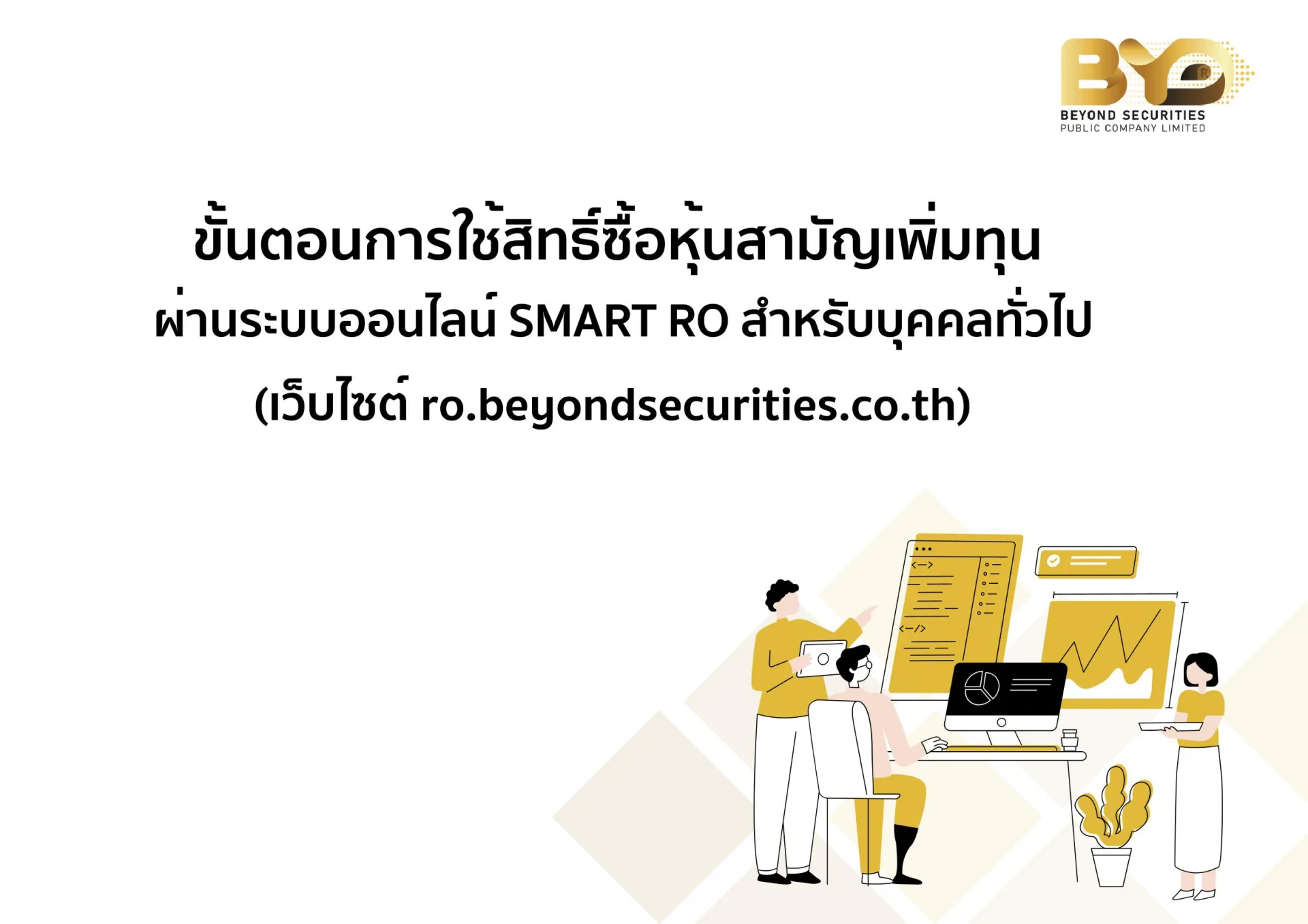 การจัดสรรหุ้นเพิ่มทุน ขั้นตอนใช้สิทธ์ซื้อหุ้นสามัญเพิ่มทุนผ่านระบบออนไลน์ SMART RO สำหรับบุคคลทั่วไป คู่มือขั้นตอนการใช้ หนังสือแจ้งการจัดสรรหุ้นสามัญเพิ่มทุน หนังสือแจ้งการจัดสรรหุ้นสามัญเพิ่มทุน ควบคู่กับใบสำคัญแสดงสิทธิที่จะซื้อหุ้นสามัญ รุ่นที่1 (EA-W1) ดาวน์โหลด