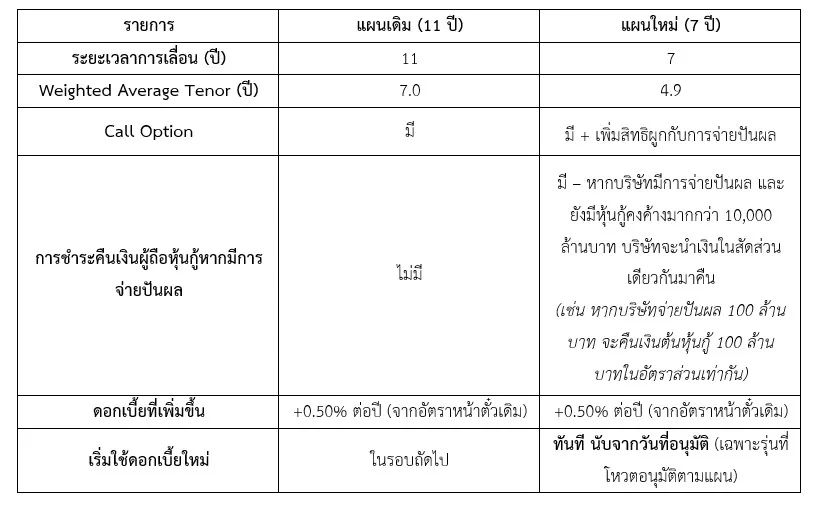 สรุปสิทธิประโยชน์ตามแผนใหม่ (สำหรับผู้ถือหุ้นกู้ในแต่ละรุ่นที่อนุมัติ)