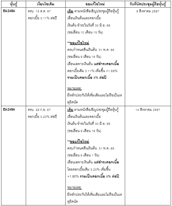 ในส่วนของหุ้นกู้ 2 รุ่น ประกอบด้วย หุ้นกู้รุ่นที่ 1 EA248A วงเงิน 1,500 ล้านบาท ซึ่งจะครบกำหนดชำระ ในวันที่ 15 สิงหาคม 2567 และ หุ้นกู้รุ่นที่ 2 EA249A วงเงิน 4,000 ล้านบาท ซึ่งจะครบกำหนดชำระในวันที่ 29 กันยายน 2567 บริษัทฯจะดำเนินการขอเลื่อนกำหนดการไถ่ถอนหุ้นกู้ที่จะครบกำหนดชำระออกไป พร้อมทั้งเพิ่มอัตราดอกเบี้ยเป็น 5% ต่อปีทั้ง 2 รุ่น และมีหลักประกันให้เพิ่มเติมโดยไม่ถือเป็นเหตุผิดนัด โดยบริษัทฯยืนยันว่าจะชำระดอกเบี้ยที่จะครบกำหนด เพียงขอเลื่อนการไถ่ถอนเฉพาะเงินต้นเท่านั้น